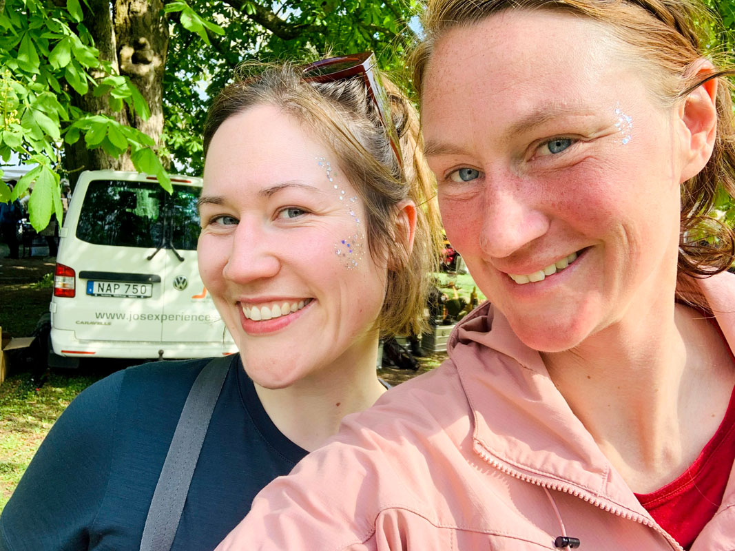 Victoria und ich schlüpfen in ein Doppelkajak und paddeln los – vorbei an Zelten, der Bühne, auf der gerade ein Vortrag zur nachhaltigen Outdoor-Kultur stattfindet, und Zuschauern, die am Graben sitzen und die Paddelnden anfeuern. Oder sich darüber amüsieren, wenn jemand die Balance verliert. Es ist ein skurriles Bild: Barocke Schlosskulisse und bunte Boote, die teilweise leicht ungestüm durch den Graben navigiert werden, untermalt von den Gitarrenklängen eines Singer-Songwriters. Später entdecken Victoria und ich ein Lagerfeuer, um das sich einige Frauen versammelt haben, um Stöcke und Steine mit bunten Stiften zu verzieren. »Wir bemalen, was der Wald uns schenkt«, sagt Louise Livskraft, die diesen Naturkunst-Workshop organisiert. »Die Wildnis gibt gerade uns Frauen so viel Kraft und lässt uns frei und mutig werden. Das wollen wir hier gemeinsam zelebrieren.« Auch wir lassen uns am Feuer nieder und bemalen jede einen Stein. Während wir uns ein wenig vom Festivaltrubel entspannen, geraten wir in einen fast meditativen Zustand. Louises Stimme holt uns zurück, als sie uns fragt, ob sie uns mit ein wenig Glitzer schminken soll, bevor sie alle dazu animiert, gemeinsam ein Mandala aus den bemalten Steinen zu legen.