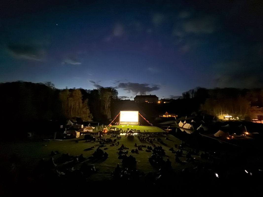 Als der Himmel langsam in warmes Abendlicht getaucht ist, speisen Philipp, Victoria und ich Gemüsebowls und vegetarisches Smørrebrød. Die große Wiese vor dem Schloss hat sich mittlerweile in ein Freiluftkino verwandelt. Vor dem Schlossgraben wird das Banff Mountain Film Festival gezeigt. In Daunenjacken gehüllt und auf Campingstühlen sitzend, lassen wir uns von Kurzfilmen über Skitouren, Kletterabenteuer und Mountainbike-Trips inspirieren, während hier und da Hände in Chipstüten knistern.