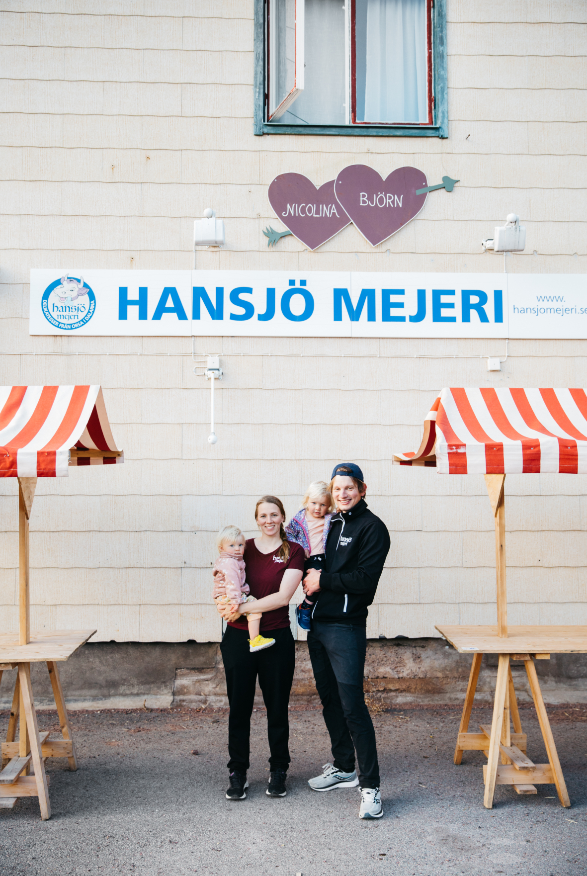 Käse, Brot und Marmelade – vor der Molkerei Hansjö, einen halben Kilometer nördlich von Orsa, warten die wichtigsten Lebensmittel in ihren jeweiligen Marktständen. Das Sauerteigbrot stammt aus der neu gegründeten Bäckerei Levebröd in Våmhus und die Sanddornbeeren in der Marmelade von einem Paar aus Orsa, das sich auf die Kombination von Naturführungen und Sanddornanbau spezialisiert hat. Der Käse wird von Björn und Nicolina Daniels hergestellt, die seit 2019 die kleine Handwerksmolkerei Hansjö Mejeri betreiben. Auf dem Tisch vor ihnen liegt unter anderem Gulla, ein gereifter Hartkäse, der 2022 bei den NM i mathantverk (NM im Bereich Lebensmittelhandwerk) Gold gewann. „Wir haben viel daran gearbeitet, ihn zu entwickeln, daher war es unglaublich schön, so eine positive Resonanz zu bekommen“, sagt Björn. Er übernahm die Molkerei von seinen Eltern, die einen Milchviehbetrieb führten, und begann mit der Käseherstellung, um die Milchproduktion zu ergänzen. Heute leitet sein älterer Bruder Johan Daniels den Milchviehbetrieb, während Björn und Nicolina aus der ökologisch zertifizierten Milch-Käse und andere Milchprodukte herstellen.