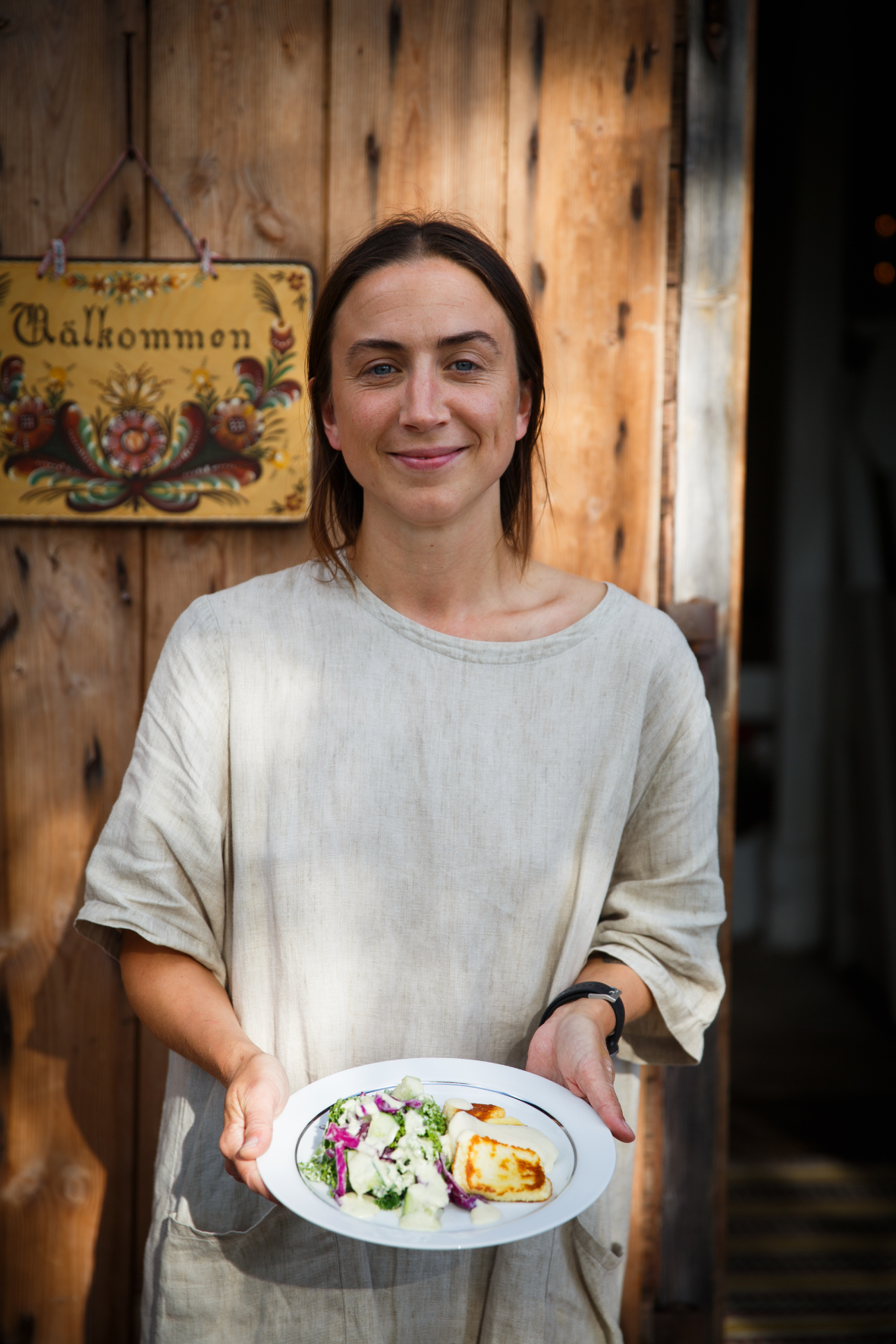 Auf der anderen Straßenseite in Hansö hat Solsyran frisch geerntetes Gemüse aufgereiht und den Hofladen mit milchsauer vergorenen Produkten gefüllt. Und im Café neben der Molkerei gibt Frö, ein renommiertes Restaurant in Sälen, ein Gastspiel. Auf der Speisekarte stehen Gemüse von Solsyran, Gelberbsencreme und Joghurt aus der Molkerei, garniert mit Schweinebauch aus Leksand oder Grillkäse aus Hansjö. „Es ist schön, dass wir so gute Zutaten bei unseren Nachbarn kaufen können“, sagt Emma Ramirez und schenkt Frös hauseigenes Kombucha mit Krähenbeeren- und Rosengeschmack ein.