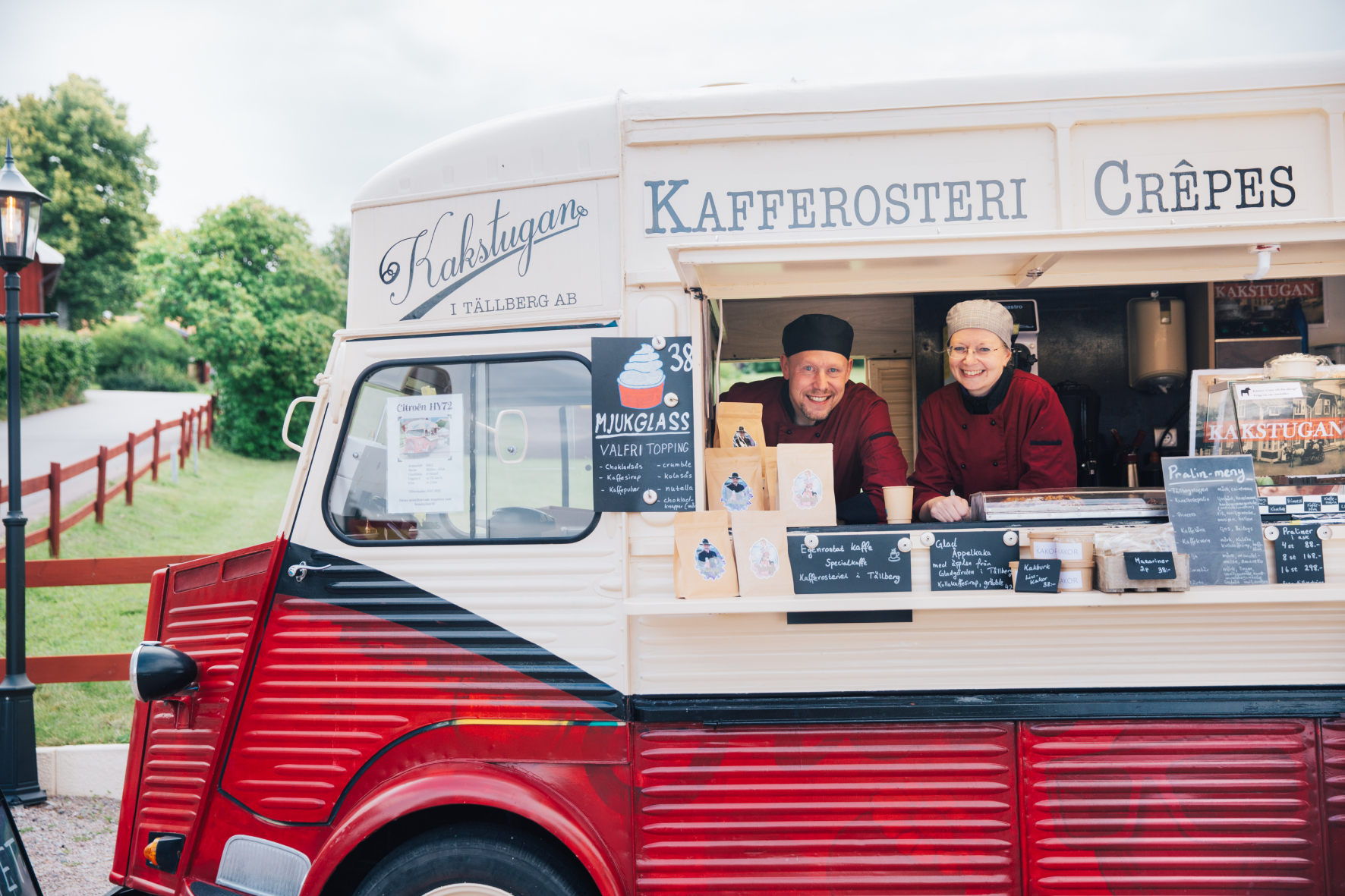 Der Lieferwagen, ein Citroën HY aus dem Jahr 1965, steht vor dem alten Landladen von Tällberg, den das Paar vor zehn Jahren übernommen hat. Damals war das Haus dringend renovierungsbedürftig, aber jetzt verwandeln sie es in eine permanente Keksstube mit Café. Der Retro-Lieferwagen ist in der Zwischenzeit ein schwer zu schlagender Vertriebskanal. Ein paar Touristen halten an und bestellen an der kleinen Luke. Kurz darauf kommt Tony Holm heraus und serviert Citro(ë)ncrepes und eine „Falu röd”-Galette mit Falukorv in Form von Dalahästar. (dt. Den traditionellen Holzpferfden aus Dalarna).