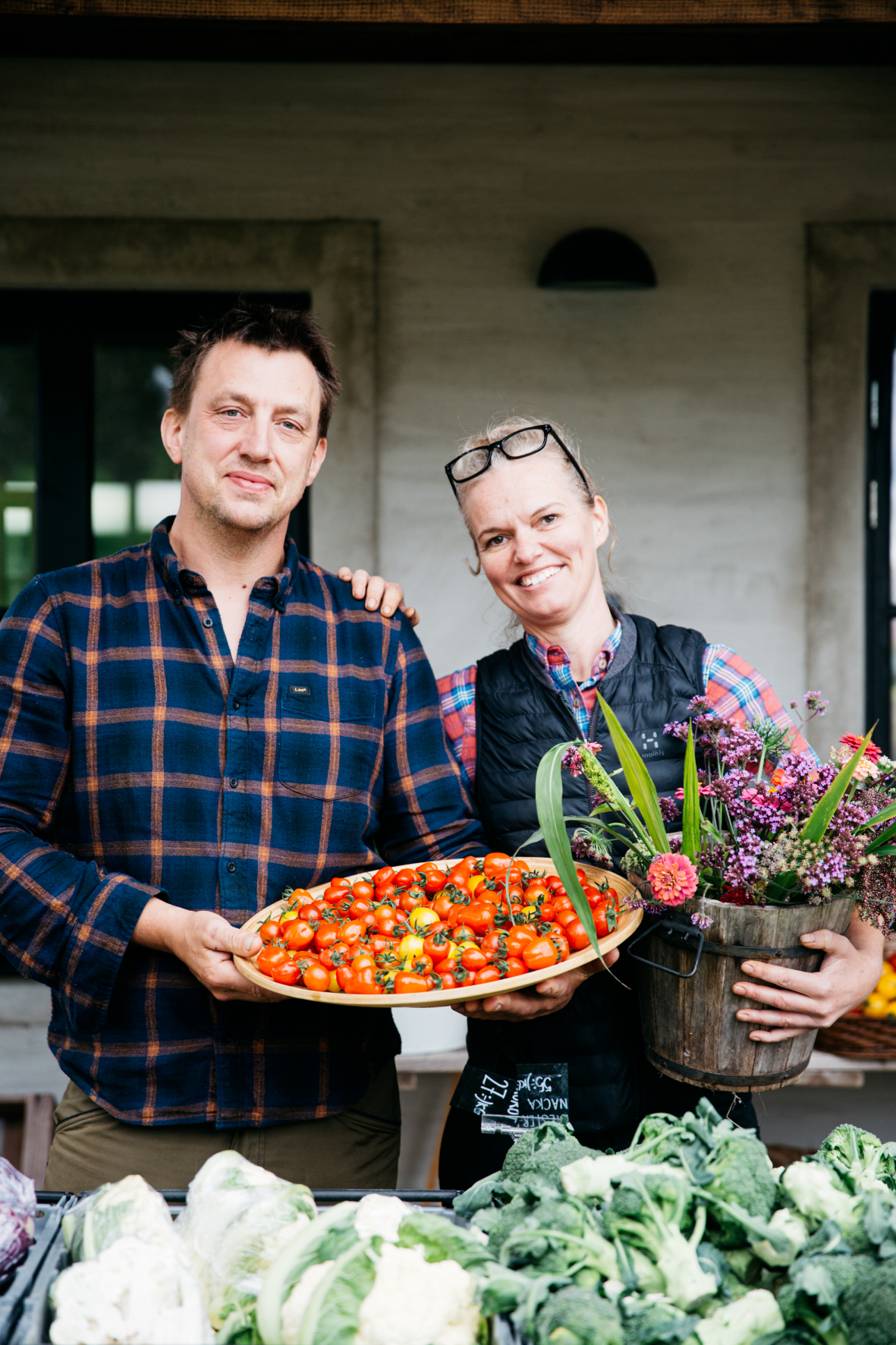 Ein paar Kilometer weiter nördlich, im Dorf Laknäs an der idyllischen Siljansvägen, werden wir von Emma und Johan Erkers begrüßt. Sie kamen auf die Idee, einen Hofladen zu eröffnen, nachdem sie festgestellt hatten, dass sie selbst nicht alles essen konnten, was sie anbauten. Sie begannen mit einem provisorischen Gemüsestand am Straßenrand und bauten kurz darauf das Holzlager des Hofes zu einem kleinen Selbstbedienungsladen um. Als auch dieser zu klein wurde, entschied sich das Paar für einen Neubau, was zu einem großen, roten, stallähnlichen Gebäude führte, das im vergangenen Jahr eingeweiht wurde.