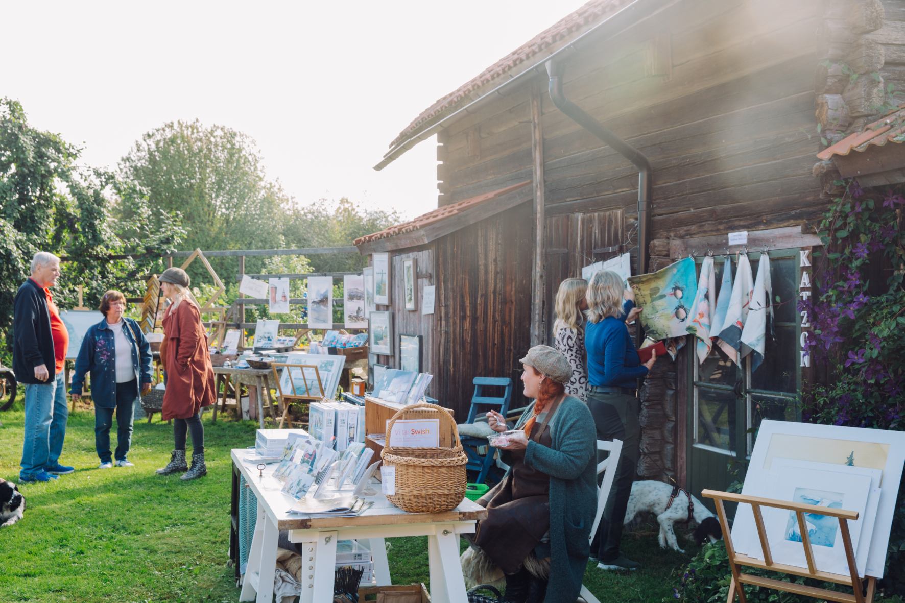 An diesem Samstag ist der Garten von unzähligen lokalen Handwerkern und Künstlern bevölkert, die ihre Werke verkaufen. Außerdem werden essbare Handwerksprodukte in Form von Brötchen, Cupcakes und anderen selbstgebackenen Leckereien serviert, die mit frischen Blumen dekoriert sind. Die Schlange vor dem lindgrünen Café-Fenster im Stall ist lang. Und überall im Garten sitzen Menschen und genießen ihren Kaffee: unter einer schattenspendenden Weinlaube, zwischen üppigen Apfelbäumen und an der sonnigen Stallwand.