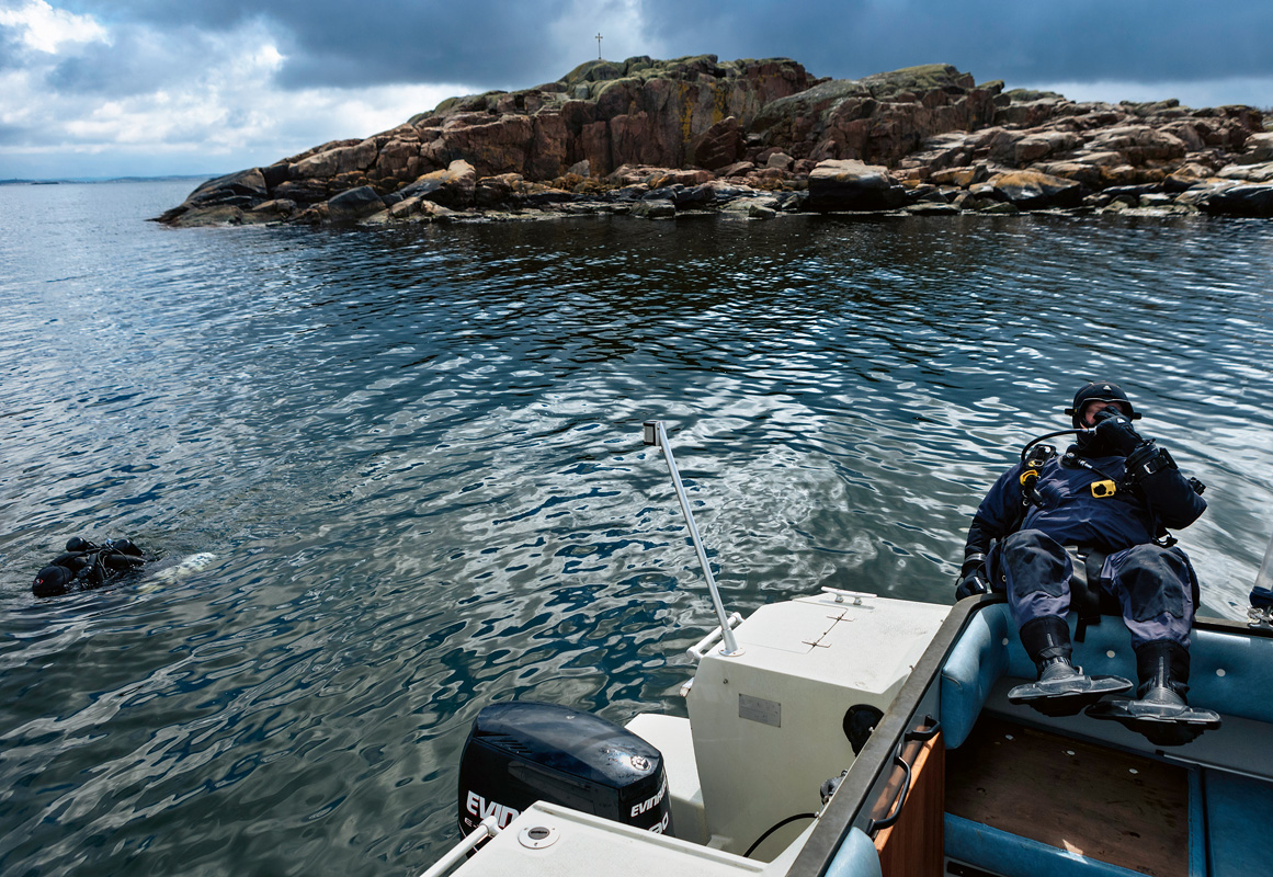 Eine halbe Stunde später treffen sich die beiden Boote vor dem Leuchtturm Vinga, den die schwedischen Liedermacher und Sänger Evert Taube, Lasse Dahlquist und Håkan Hellström besungen haben. Palle Hultsbo hisst die weiß-blaue Tauchflagge, die anderen Booten signalisiert, dass hier Taucher im Wasser unterwegs sind. Als Erster geht Pontus Edvardsson runter. Er hat kürzlich in batteriebeheizte Funktionsunterwäsche investiert, deshalb kann ihn das kalte Meerwasser nicht schrecken.