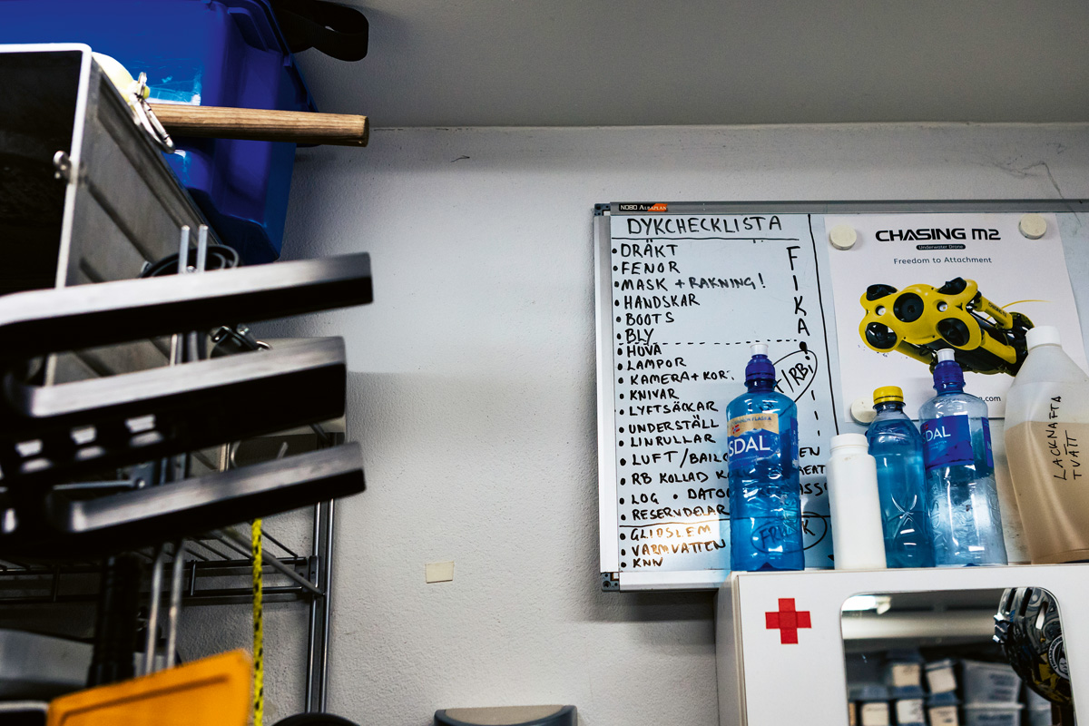 Die Temperatur des Meerwassers liegt bei sieben Grad. Der Regen bleibt in der Luft hängen, und der Himmel zeigt ein hässliches Stahlgrau. Die Luft ist so kalt, dass beim Reden Dampfwölkchen aus dem Mund kommen. »Perfektes Tauchwetter!«, bemerkt der Taucher Palle Hultsbo ohne jede Ironie. Das Wichtigste ist, dass es nicht stürmt und dass die Unterwasserströmung nicht zu kräftig ist. Solange das Meer eisfrei bleibt, gibt es keine Probleme. Gerade heute sind die Bedingungen zufällig ausgezeichnet, und jeden Moment können die anderen Taucher eintreffen. Vorher geht Palle noch ins Hauptquartier, das sich in seiner Garage auf Hönö im nördlichen Schärengarten von Göteborg befindet. Hier drinnen ist schon seit Jahren kein Platz mehr für ein Auto. Stattdessen sind hier Taucherausrüstungen und ein paar Mopeds untergebracht.