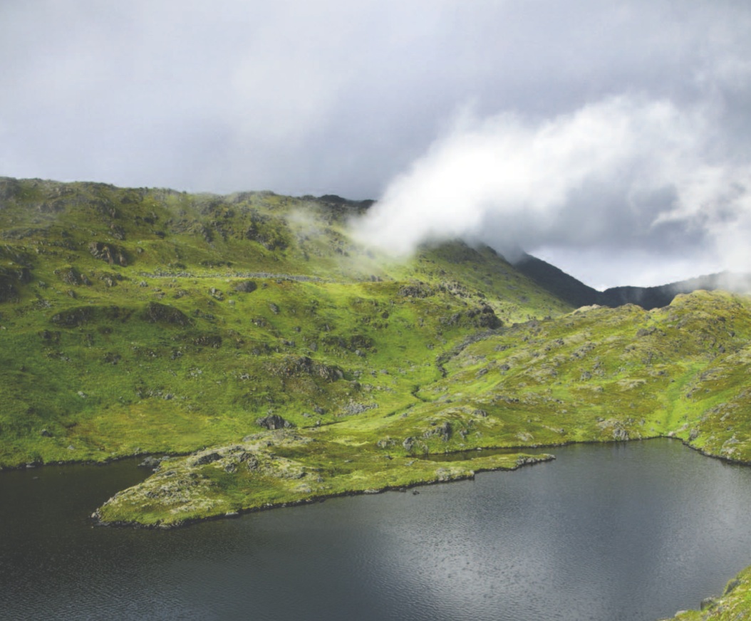 Ein paar hundert Höhenmeter über dem Meer bieten sich in kleinen Wolkenlücken wundersame Ausblicke über tiefgrüne Hänge bis hinunter zum grau leuchtenden Meer. Ein Kontrast, der immer wieder überrascht, denn eigentlich ist man gewohnt, nicht gleichzeitig im Gebirge und am Meer sein zu können. Hier ist das anders. Dazu beeindruckt eine sonderbar gewellte Landschaft, in deren Senken sich viel Wasser gesammelt hat – zu Tümpeln, kleinen und großen Seen.