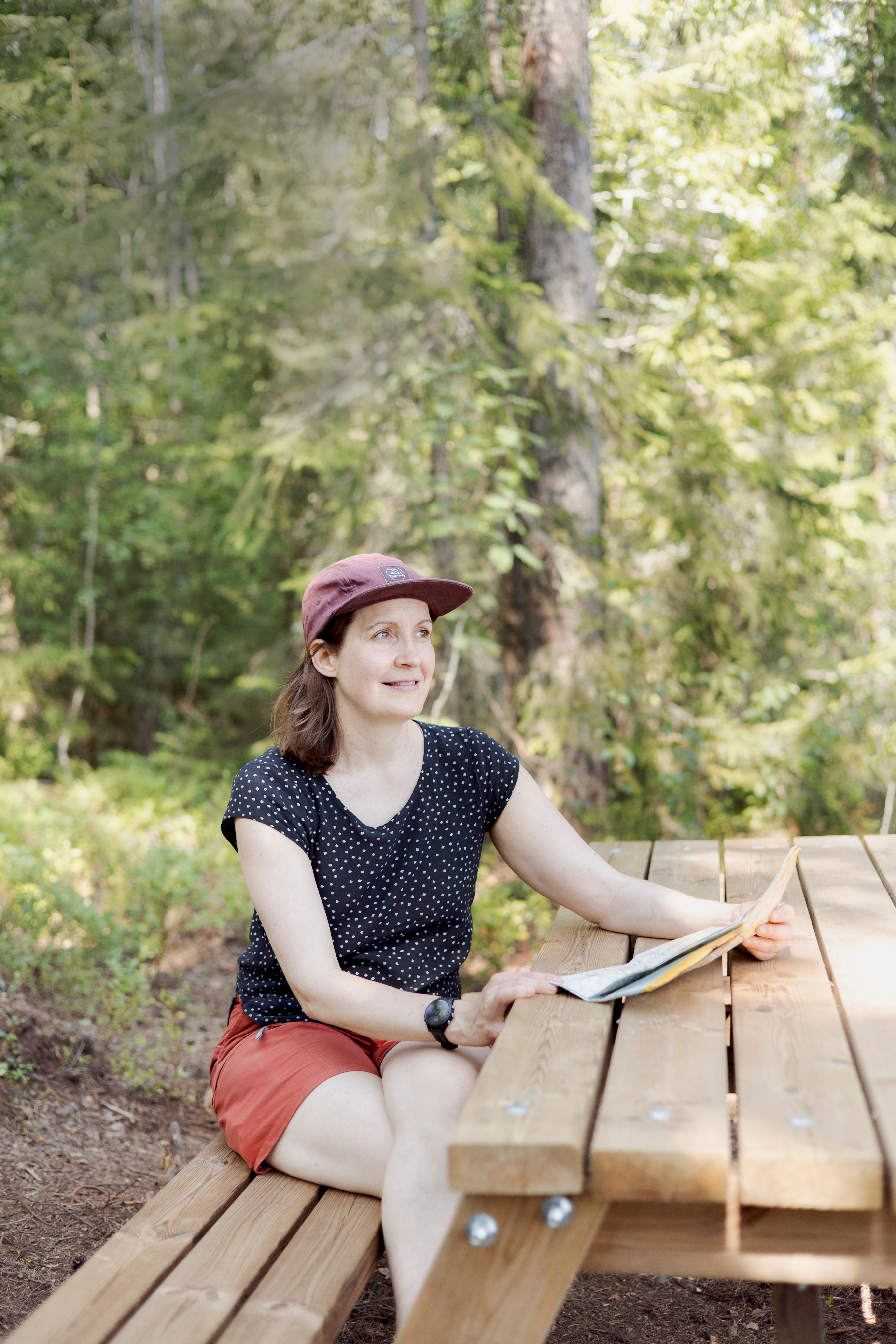 Das Restaurant entstand, als Matti Seppälä, der Besitzer eines Antiquitätengeschäfts in Helsinki, feststellte, dass der Verkauf von gebrauchten Büchern kein rentables Geschäft mehr war. Mit seiner Frau Kaisa Rantama gründete er das Restaurant Tila. Kaisa betrieb hier bereits eine Käserei. Was von dem Antiquariat übrig geblieben ist, sind die Bücher, die die Vitrine des Restaurants schmücken. Man kann sie kaufen, wenn man eines findet, das einem gefällt. Vorerst müssen sie aber im Regal bleiben. Der Rucksack braucht kein zusätzliches Gewicht. Nach dem Mittagessen wollen wir uns auf den Weg machen. Hinter den hohen Kiefern und Birken eröffnet sich eine malerische Aussicht. Der Fiskträsk ist der größte See in Sipoonkorpi und liegt auf halber Strecke des knapp fünf Kilometer langen Fiskträsk-Rundweges. Auf der blauen Oberfläche des Wildnissees spiegeln sich weiße Wolken. In der Nähe gibt es eine schöne Badestelle. Sobald man eintaucht, ist das Leben für einen Moment perfekt. Lasse Huusela angelt mit seinen drei kleinen Söhnen an dem angrenzenden Lagerfeuerplatz. »Die Jungs wollten campen gehen«, sagt er. Der Vater und seine Söhne wollen zwei Nächte lang zelten.