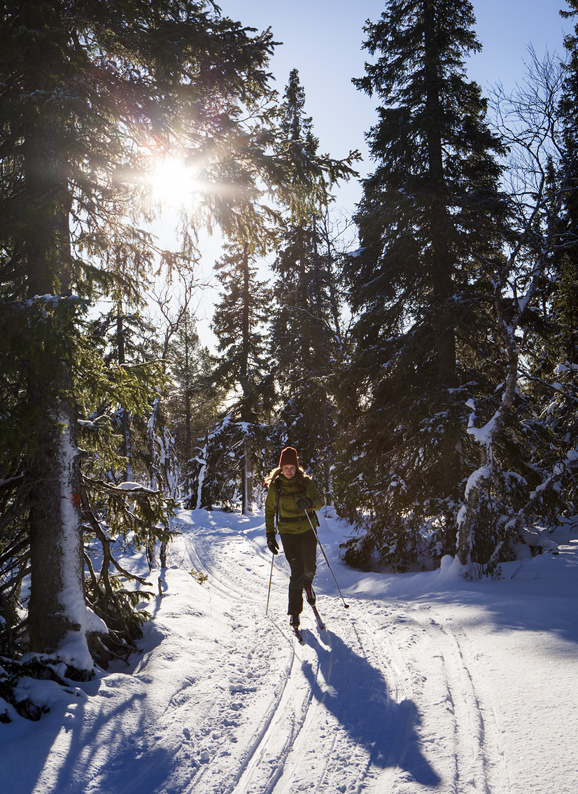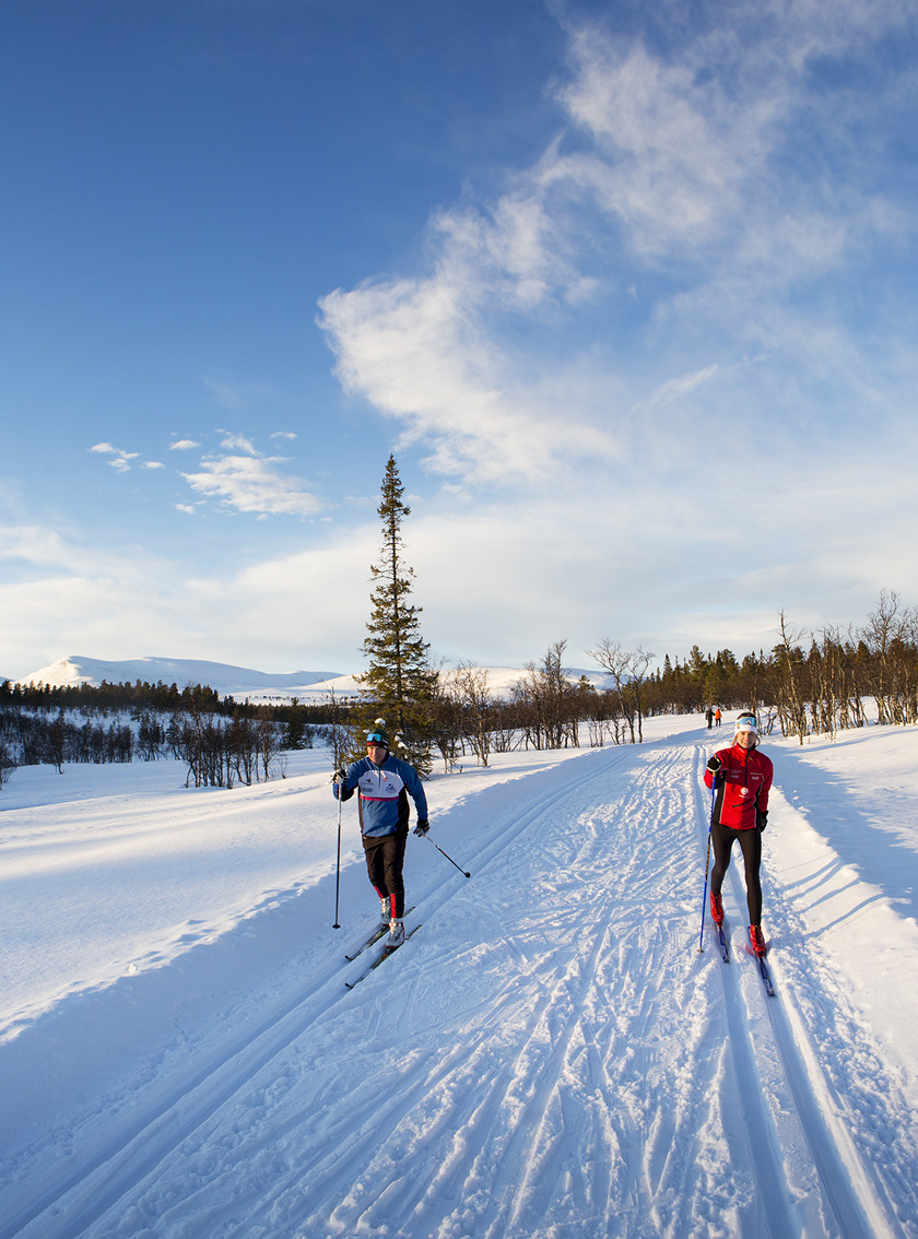 Die Morgensonne hat sich gerade über die Baumwipfel geschoben, als sie über das offene Wasser des Flusses Grövlan schleicht. Stück für Stück erobert sie den Himmel mit Lichtflecken, die wachsen und größer werden, bis sie die Hängebrücke bei der Sjöstuga erreicht. Und dort kommen wir an, mit Proviant im Rucksack und Langlaufskiern unter den Füßen. Jetzt fehlt nur noch die Spur. Deshalb bin ich erleichtert, als ich ein Schneemobil über das Eis des Sees fahren sehe, mit einem Schlitten im Schlepptau. Wir folgen der frischen Loipe auf der anderen Seite der Brücke und genießen die Tour – auch wenn der Anstieg zum Berg uns bald zu einem höheren Puls zwingt. Dort oben am Horizont ist der Himmel strahlend blau, und rechts von uns erhebt sich der Gipfel des Salsfjäll mit seinen 1.281 Metern, direkt auf der anderen Seite der norwegischen Grenze. Heute glänzt er wie ein polierter Baiser in der Sonne.