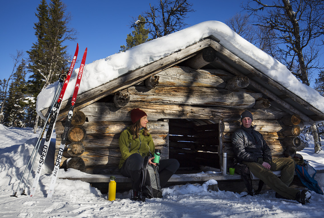 Bald erreichen wir eine T-Kreuzung und einen alten Windschutz – oder „slagbod”, wie man hier in Dalarna sagt. Das passt gut für eine erste kleine Kaffeepause, denn heute haben wir es nicht eilig. Die Strecke ist definitiv eine gemütliche Tour. Lama Alkaddah und Malin Solinger, die wir hier zufällig treffen, stimmen zu. Sie setzen sich gleichzeitig mit uns hin, um sich auszuruhen und neue Energie zu tanken. Sie haben einen Ausflug von Borås nach Idre unternommen, um ein paar Tage Ski zu fahren, und machen einen Tagesausflug nach Grövelsjön. Es sind nur dreieinhalb Kilometer bis hierher vom beliebten Skigebiet, aber es ist wie eine andere Welt. “Hier fühlt es sich wilder an. Man ist noch tiefer in der Natur”, sagt Lama. Es ist ein bisschen so, als wäre man am Ende der Straße. Aber wo die Straße endet, beginnt alles andere: Berge, Seen, Wälder, Moore – über die Landesgrenze hinaus und zurück.