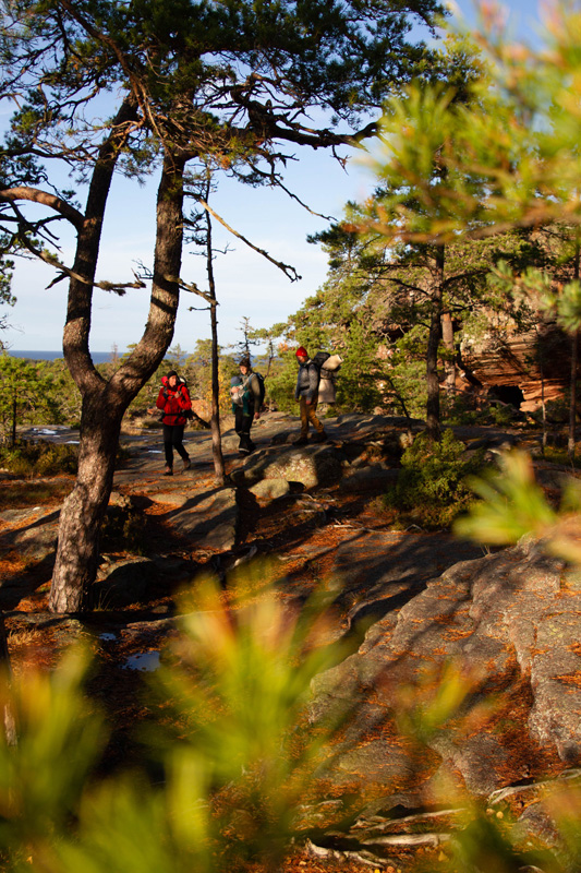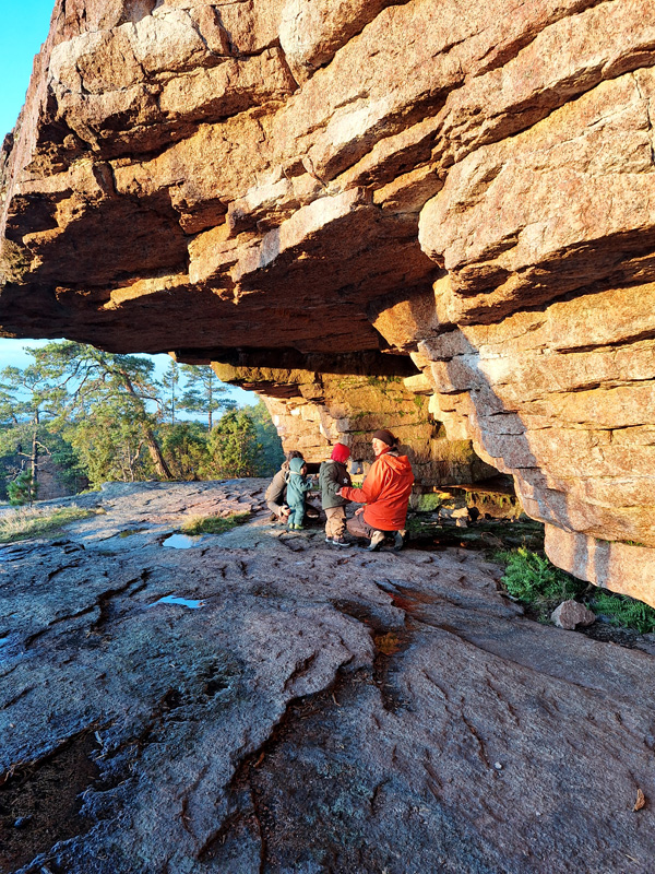 Wir starten auf dem Wanderweg Grottstigen durch eine Landschaft aus eisgeformtem Granit. Die Luft ist salzig und der Wind stark. Der Blick reicht weit über Inseln bis zum offenen Meer. Knorrige Kiefern, die sich seit Jahrzehnten dem Wind beugen, klammern sich an Felsspalten. Zwischen ihnen finden wir Höhlen. In einer davon versteckte sich die Bevölkerung während des Großen Nordischen Krieges. An einer anderen Stelle bilden die Felsen ein natürliches Amphitheater. Wir stellen uns vor, dass sich die Trollmutter hier vielleicht manchmal ein Nickerchen gönnt. Die Kinder erkunden neugierig jeden Winkel dieser steinernen Kathedrale.