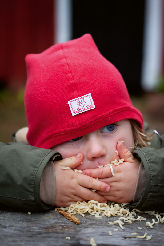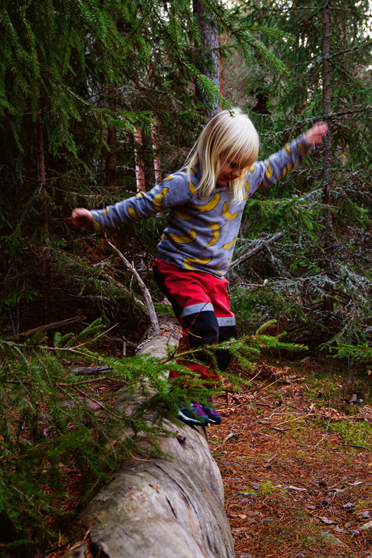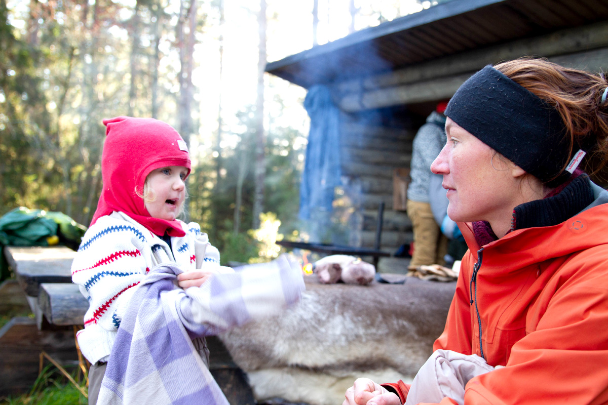 Am nächsten Morgen werden Lovisa und ich von Sunes fröhlichem Geplapper geweckt. Der Kleine krabbelt bereits munter in seinen dicken Wollsocken auf dem Waldboden herum. Die Sonne scheint durch die Tannenzweige und wir kriechen langsam aus unseren Schlafsäcken. Bald knistert wieder ein kleines Feuer, an dem wir Milch erwärmen, Brei umrühren und Kaffee kochen. Pim und Lovisa spielen Kaufmannsladen auf einem Felsen und bieten Tannenzapfen und ein paar knorrige Stöcke feil.