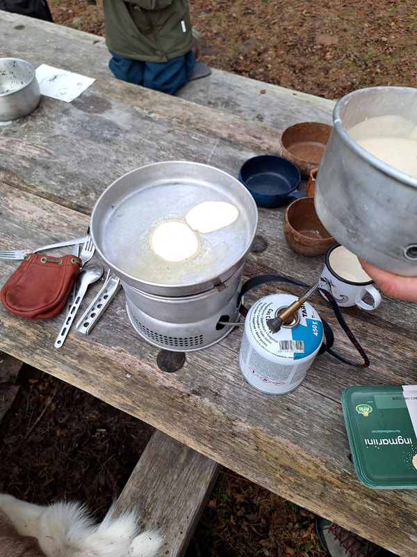 Ich war ein wenig enttäuscht darüber, dass wir nicht mit unserem Gepäck durch die Wildnis ziehen können. Und, obwohl mir das zugegeben von vornherein hätte klar sein müssen, etwas genervt davon, dass wir nur sehr langsam vorankommen. Aber gemeinsam mit Kindern gelten ganz andere Maßstäbe: die Zeit, die man braucht, um eine Handvoll Tannenzapfen zu sammeln, die Freude, wenn der erste Pfannkuchen perfekt gelingt, und das Staunen in ihren Augen, wenn die Trollmutter mit ihren geheimnisvollen Lauten antwortet. Die Tage sind voller kleiner Überraschungen, und genau das macht ihre Magie aus – ein Zauber, der nicht weniger wert ist als große Reisen, nur anders.