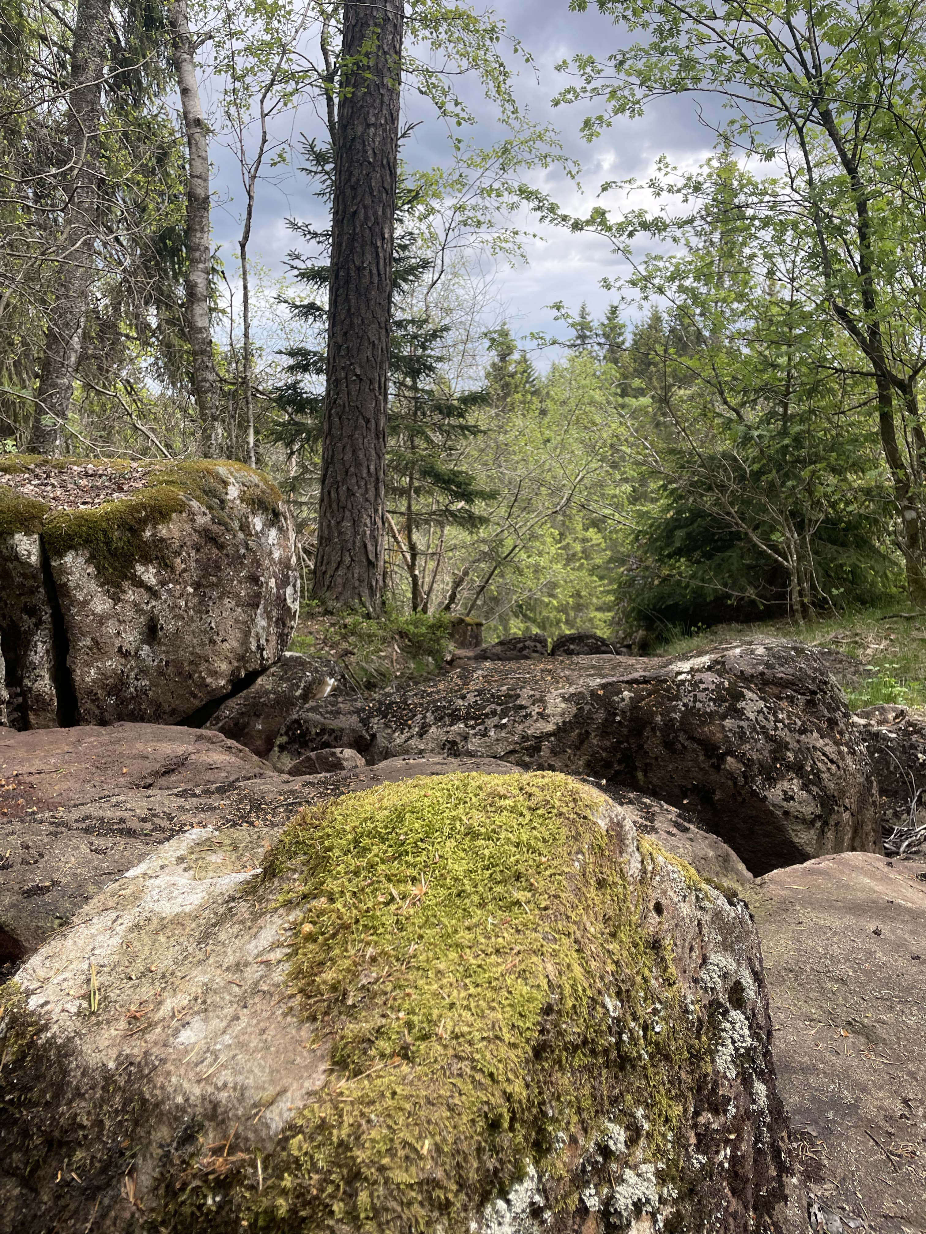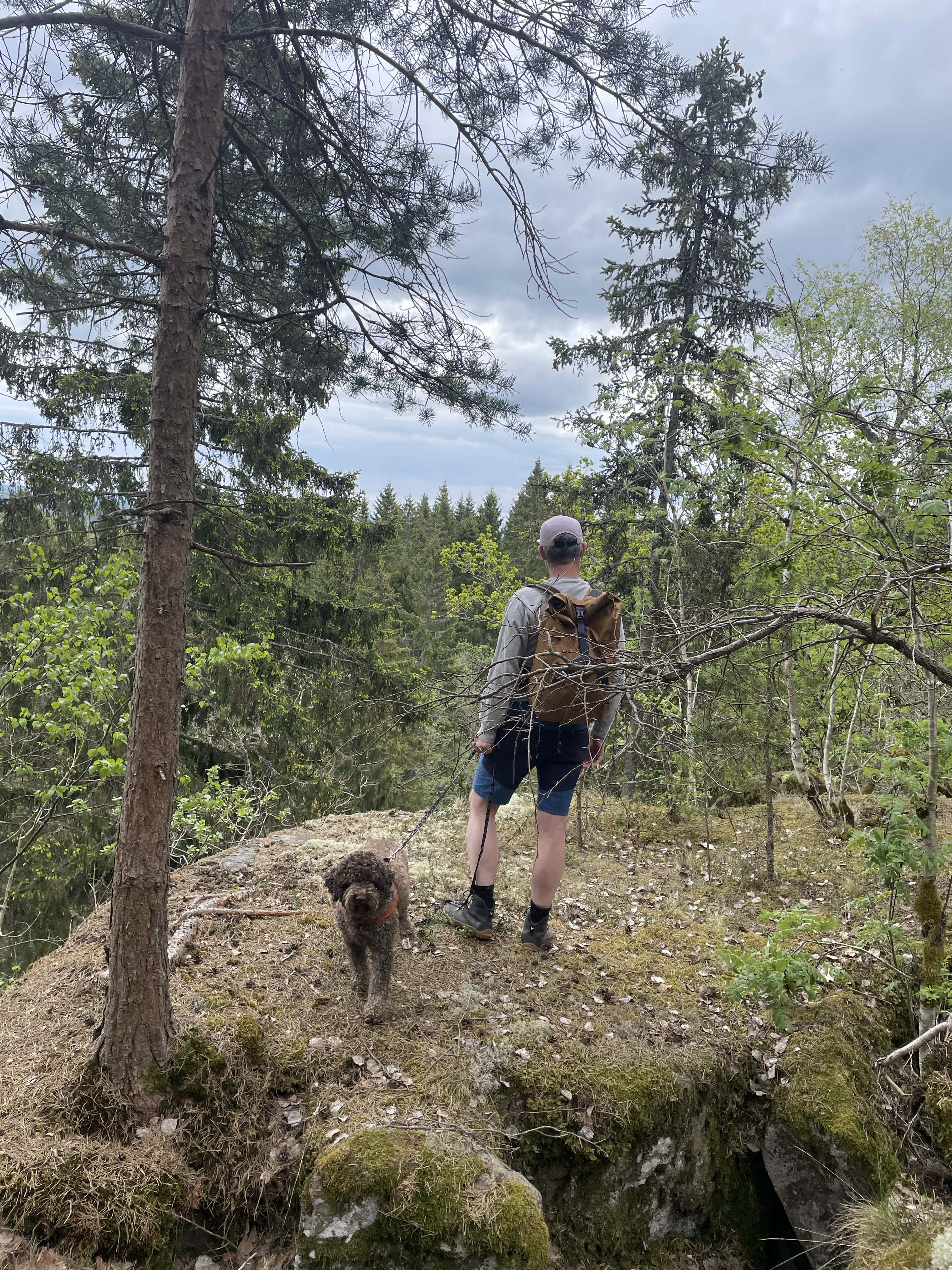 Vorbei an einer Kuhweiden, dann führt der Weg über steile Treppen zwischen Felsblöcken und Klippen hinauf aufs Plateau. Dort bewegen wir uns entlang der Bergkante. Hier gibt es mehrere Bänke und schöne Aussichtspunkte, aber wir wählen etwas später einen mit Moos bewachsenen Felsen, umgeben von Baumkronen, für unsere erste Fikapause. Wir liegen auf dem Rücken auf dem weichen Naturteppich. So schmecken Kaffee und die mitgebrachten Kanelbullar am besten.