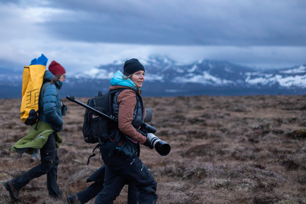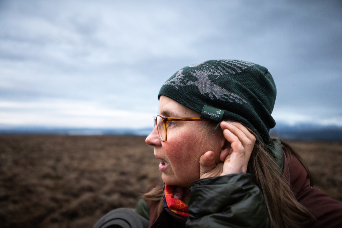 Sofie betreibt ihr eigenes kleines Naturführerunternehmen mit Sitz im nahe gelegenen Dorf Handöl und ist normalerweise schon am ersten Abend unterwegs, wenn die Vögel nach einem drei- bis viertägigen Flug aus dem Kongo landen. Die Doppelschnepfen sind pünktlich und halten sich strikt an ihre Routinen. Am 15. Mai landen sie normalerweise an den Orten im skandinavsichen Fjäll, an denen sie sich am wohlsten fühlen – gerne auf einem feuchten Moor mit reichlich Regenwürmern. „Sie mögen es nicht, wenn noch Schnee liegt, wenn sie ankommen, wie es dieses Jahr der Fall war“, stellt Sofie fest, als der Wald einem riesigen Moor weicht. Wir drehen uns auf dem Steg um und blicken auf die hohen Gipfel der Bergwelt: Storsnasen mit seinen Schneefeldern und Bunnerfjällen weiter entfernt.