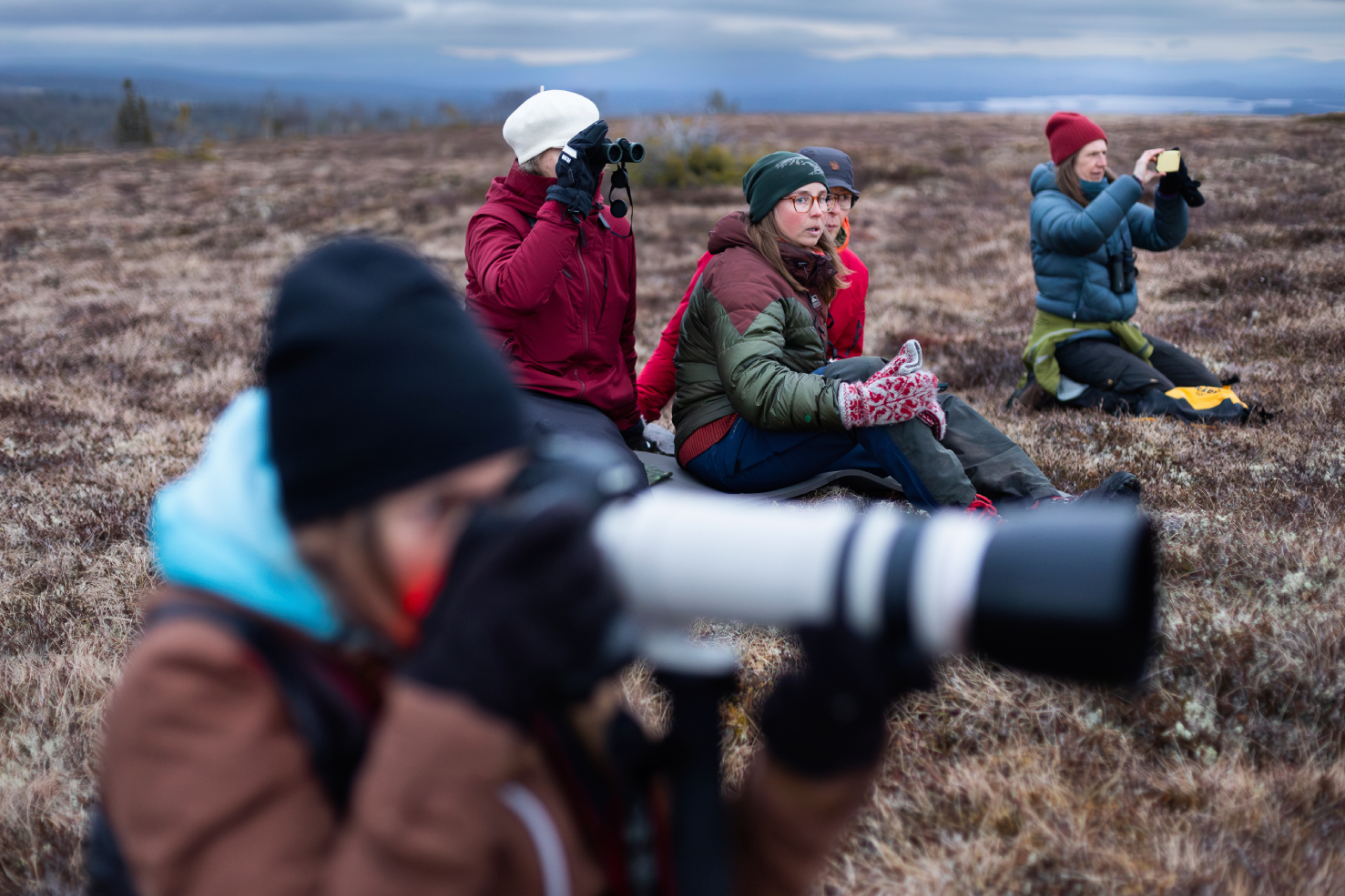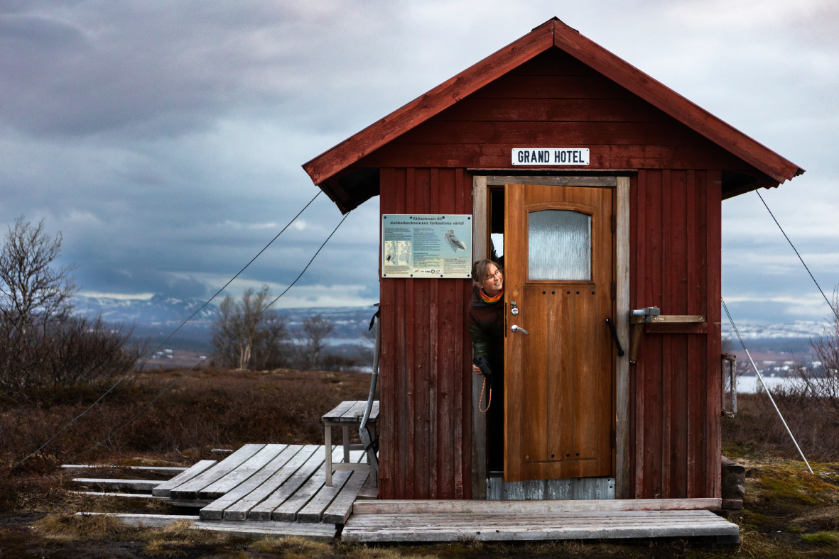 „GRAND HOTEL” steht in großen Buchstaben über der Tür. Das rote Haus ist etwa vier Quadratmeter groß. Im Inneren befinden sich ein kleiner Tisch und zwei Bänke gegenüber, auf denen die Menschen früher auf den Zug warteten. Wir befinden uns in einem alten Wartehäuschen aus der Zeit, als es noch einen Busbahnhof am Snasahögarna gab. Jetzt hat der Warteraum oben auf dem Högåsen ein neues Leben und einen neuen Zweck bekommen. Wir machen uns bereit für ein paar Stunden auf dem Moor. Einige ziehen lange Unterhosen an, andere essen etwas aus ihrem Proviant. Ich ziehe meine Daunenjacke an und bin unendlich dankbar, dass ich daran gedacht habe , sie einzupacken. Um längere Zeit still zu sitzen, braucht man eine gewisse Ausrüstung.