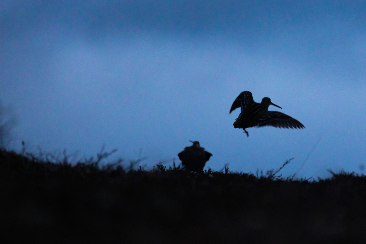 Vielleicht haben die Doppelschnepfen aber doch eine etwas raffiniertere Art, die Hierarchie zu regeln, als wir Menschen. Auf dem Moor gibt es Grasbüschel, und um diese dreht sich das Spiel, bevor die Weibchen auftauchen. Ein selbstbewusster Männchen kann sich entscheiden, einen Grasbüschel zu „besitzen“, aber er möchte gerne herausgefordert werden. Alles, um seine Größe zu zeigen.