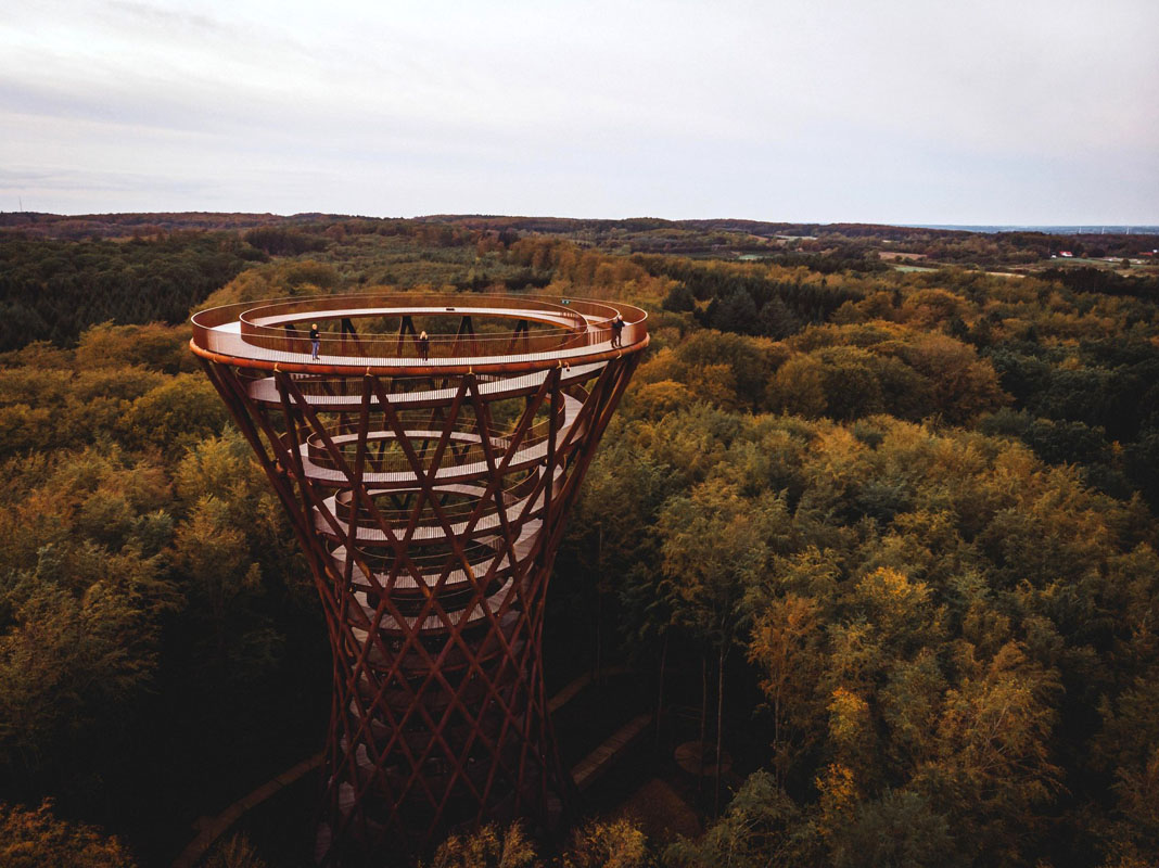 Ein langer Holzsteg führt dich durch den Wald Gisselfeld Skov spiralförmig hinauf zum 45 Meter hohen Aussichtsturm Skovtårnet. Die Wanderung ist ein Naturerlebnis für sich, und die Aussicht von oben ist fantastisch. Das Bauwerk ist Teil von Camp Adventure, das auch einen Kletterpark bietet.