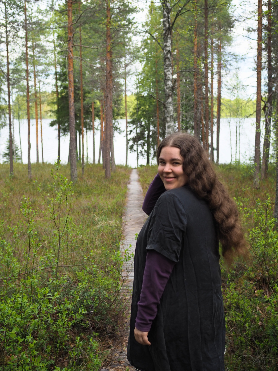 Der Weg folgt nun direkt dem Ufer des endlosen Gewässers, das geheimnisvoll zwischen den Bäumen glitzert.Dicke Äste und Baumstämme versperren dann und wann die Strecke. An einer Lichtung setzen wir uns auf die von der Sonne erwärmten Felsen. Eigentlich wollten wir uns den Kaffee in unserer Thermoskanne und die Zimtschnecken, die wir für eine stärkende Rast im Gepäck haben, für später aufsparen. Aber wir können nicht widerstehen und fallen über unser süßes Picknick her.