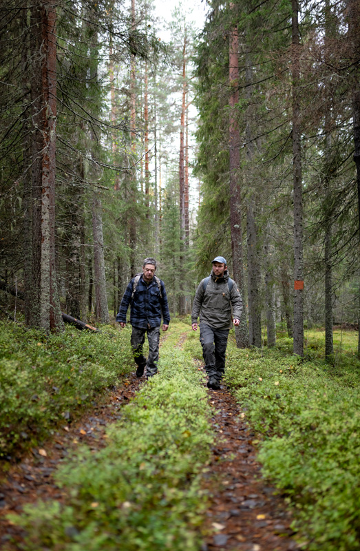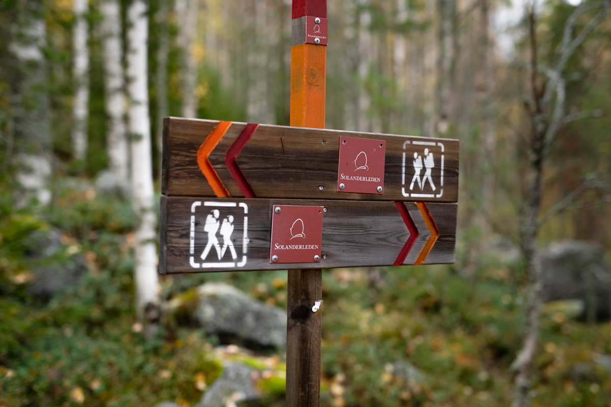 »Diese Gegend ist eine der schönsten des Solanderleden. Hier gibt es sowohl Kulturgeschichte als auch sehr schöne Natur«, sagt Hansi, als wir beginnen, den orange-roten Wegmarkierungen entlang der Landstraße zu folgen. Bald führt der Weg in den Wald. Die Stämme sind unterschiedlich groß, meist Nadelbäume, aber Streifen von Espen und Birken leuchten wie kleine Feuer in all dem Grün. Die gelben Blätter haben begonnen, von den Ästen zu fallen und bilden einen bunten Teppich. Wir befinden uns mitten im Rosfors Ekopark, einem größeren Waldgebiet mit mehreren Naturschutzgebieten.