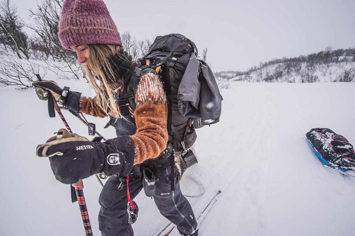 Sara Wänseth ist keine Neuling im Wintercamping und ist es gewohnt, mit schlechtem Wetter und extremen Temperaturen umzugehen. Sie hat unzählige Nächte im Freien verbracht – sowohl auf kürzeren Touren in ihrer Heimat zusammen mit anderen als auch auf langen Soloabenteuern wie dem entlang des »Vita Bandet«. Wenn sie selbst wählen kann, zieht sie den Winter dem Sommer vor. »Ich finde, dass es im Winter mehr Abwechslung gibt und oft etwas bequemer ist, zu zelten. Der Boden ist ebener, es gibt keine Moore darunter und man wird selten auf die gleiche Weise nass. Außerdem gibt es immer Zugang zu sauberem Wasser. Und im Winter hat man keine Mücken«, sagt Sara Wänseth.
