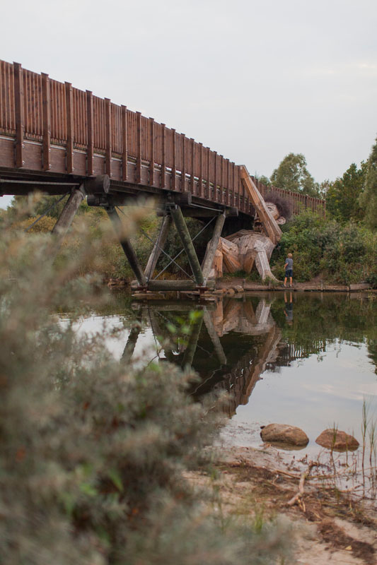 Im Naturgebiet Hakkemosen westlich von Kopenhagen liegt ein ruhiger, kleiner See. Ein kurzer, leicht befahrbarer Radweg führt um ihn herum – ideal zum Radeln mit Kindern. An seiner Südseite thront ein Holztroll des Künstlers Thomas Dambo, der Wandernde über einen Bach begleitet.
