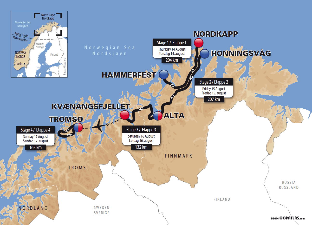 Schon im letzten Jahr zeigten sich Besucher sowie Radfahrer überwältigt von der Schönheit Nordnorwegens, die sie während ihrer großen Tour von Bodø nach Harstad umgab. In diesem Jahr radeln die internationalen Radsportprofis sogar noch weiter in die verborgenen Tiefen des Nordens. Die Strecke verläuft zwischen Hammerfest und Tromsø und erreicht dabei sogar den nördlichsten Punkt Europas; den Nordkap. Dort hat man als Besucher eine 400 Meter weite Aussicht über das wilde Nordpolarmeer. Weiter geht es über Alta und Honningsvåg aufwärts nach Kvænangsfjellet. Und wenn schließlich das Ziel in Tromsø erreicht wird, haben die Teilnehmer eine Route von insgesamt 708 Kilometer zurückgelegt.